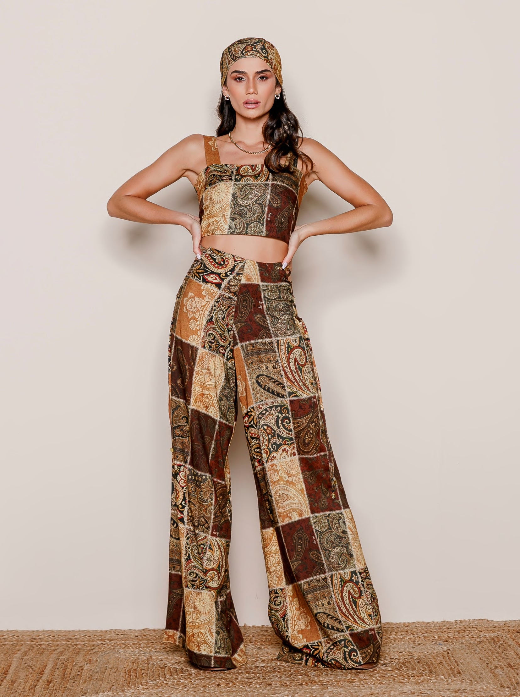 Stamped Linen Set with Adjustable Zippered Pants and Tie-Back Top