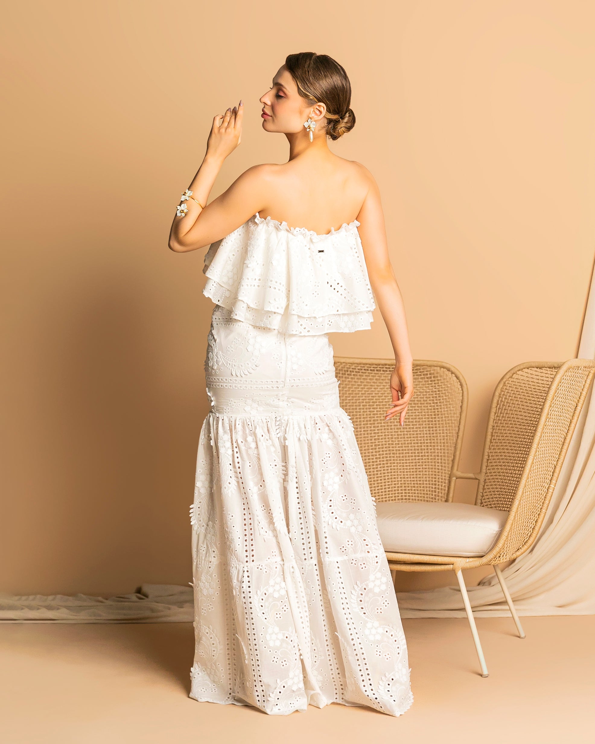 Elegant with a touch of rustic charm, this Laise Set features a beautifully detailed long skirt paired with a crisp white top. The skirt showcases the intricate texture of laise fabric, offering movement and femininity, while the white top adds a fresh, structured contrast. A timeless duo for warm days and refined occasions.