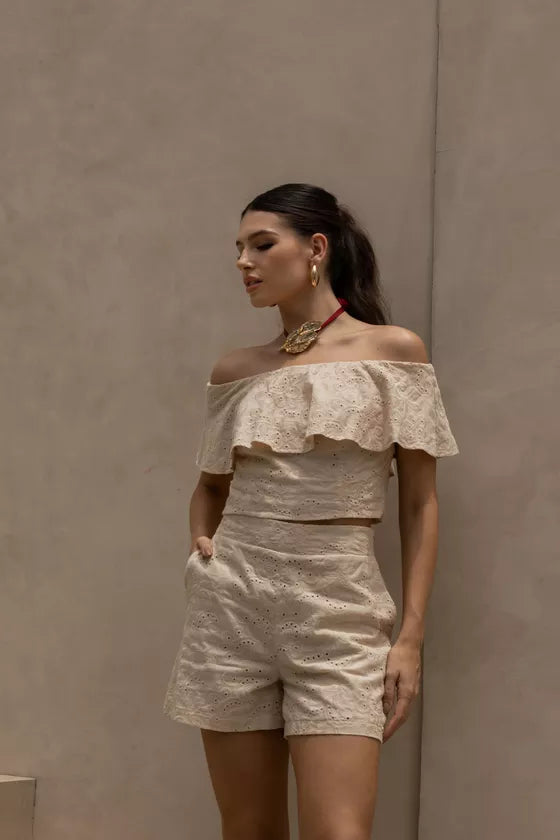 Breezy, romantic, and full of charm, the Laise Set with Shorts and Gypsy Blouse brings effortless summer elegance. Made from delicate laise (eyelet lace), this coordinated look features airy high-waisted shorts and an off-the-shoulder gypsy-style blouse with soft gathers and feminine volume. A perfect blend of boho chic and Brazilian flair.