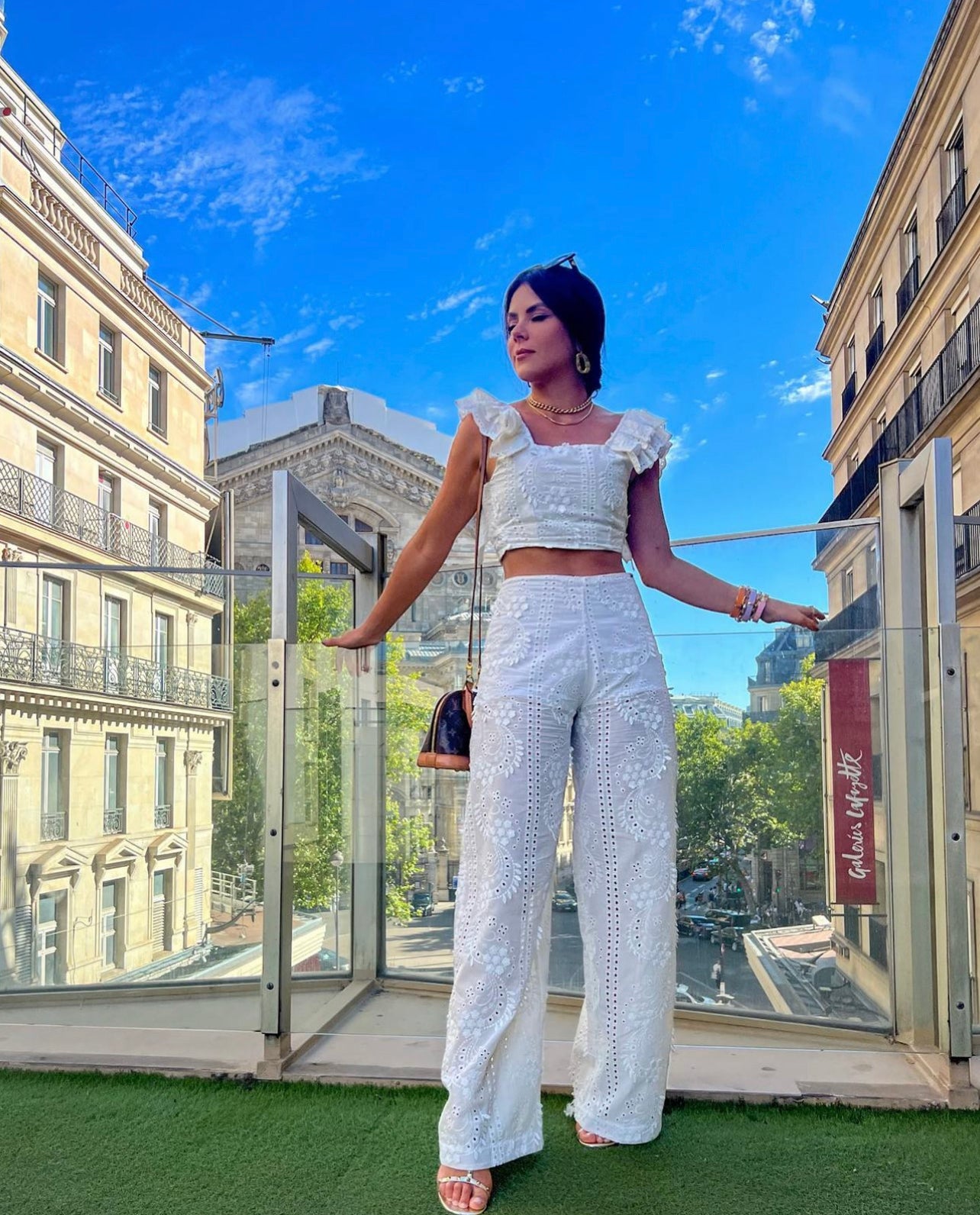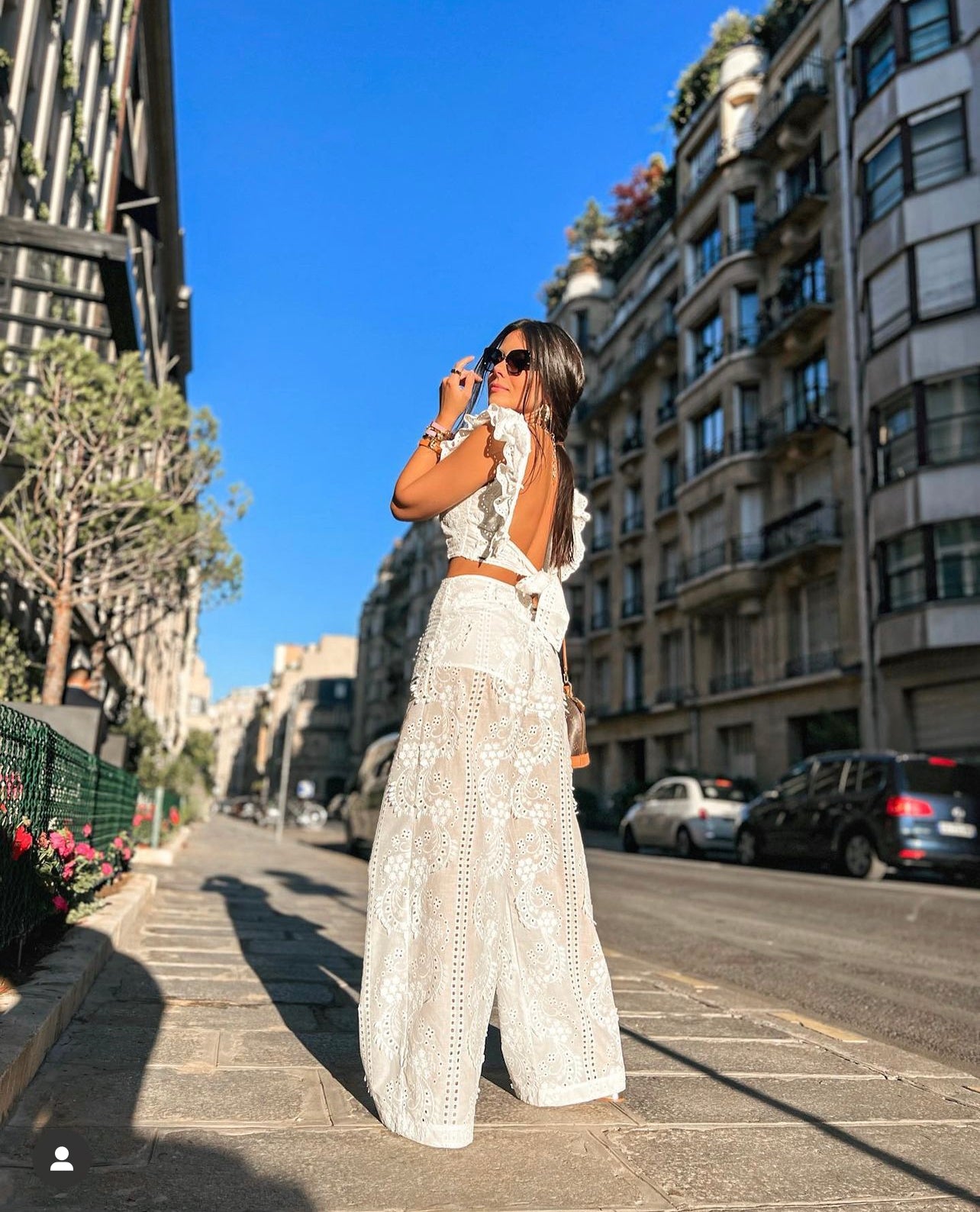 Delicate yet bold, this Laise (broderie anglaise) set pairs the timeless beauty of embroidered cotton with the modern ease of flowy silhouettes. The high-waisted palazzo pants offer graceful movement and all-day comfort, while the sleeveless top features a flattering open back with an elegant tie closure. A fresh, breathable set that’s as romantic as it is effortless.