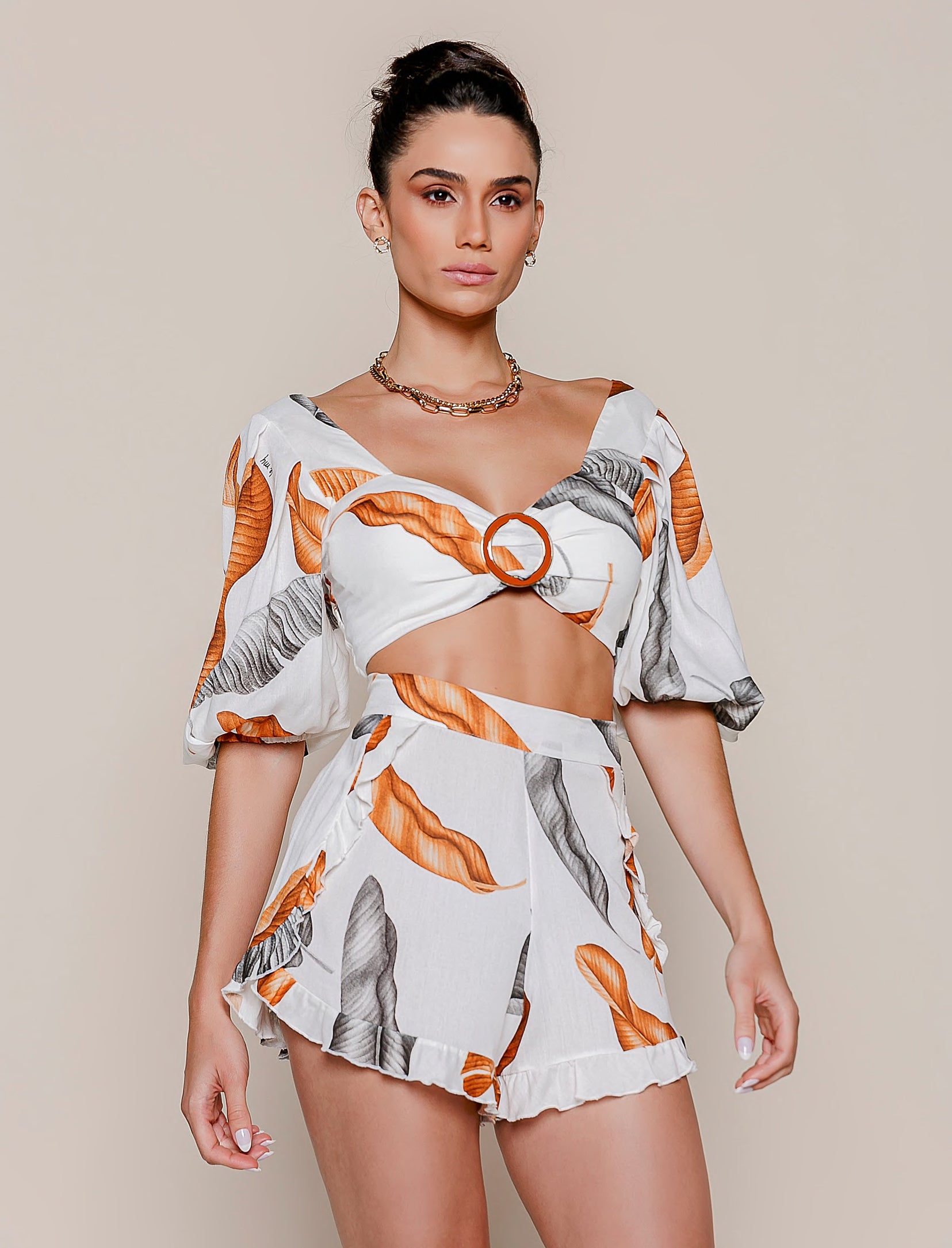 Fresh, breezy, and full of personality, this stamped linen set features a lightweight top with eye-catching front detail—such as a twist, tie, or gathered finish—paired with coordinated high-waisted shorts. The vibrant stamped print adds a playful touch to the natural texture of linen, making this an easy-chic choice for warm days and sunny getaways.