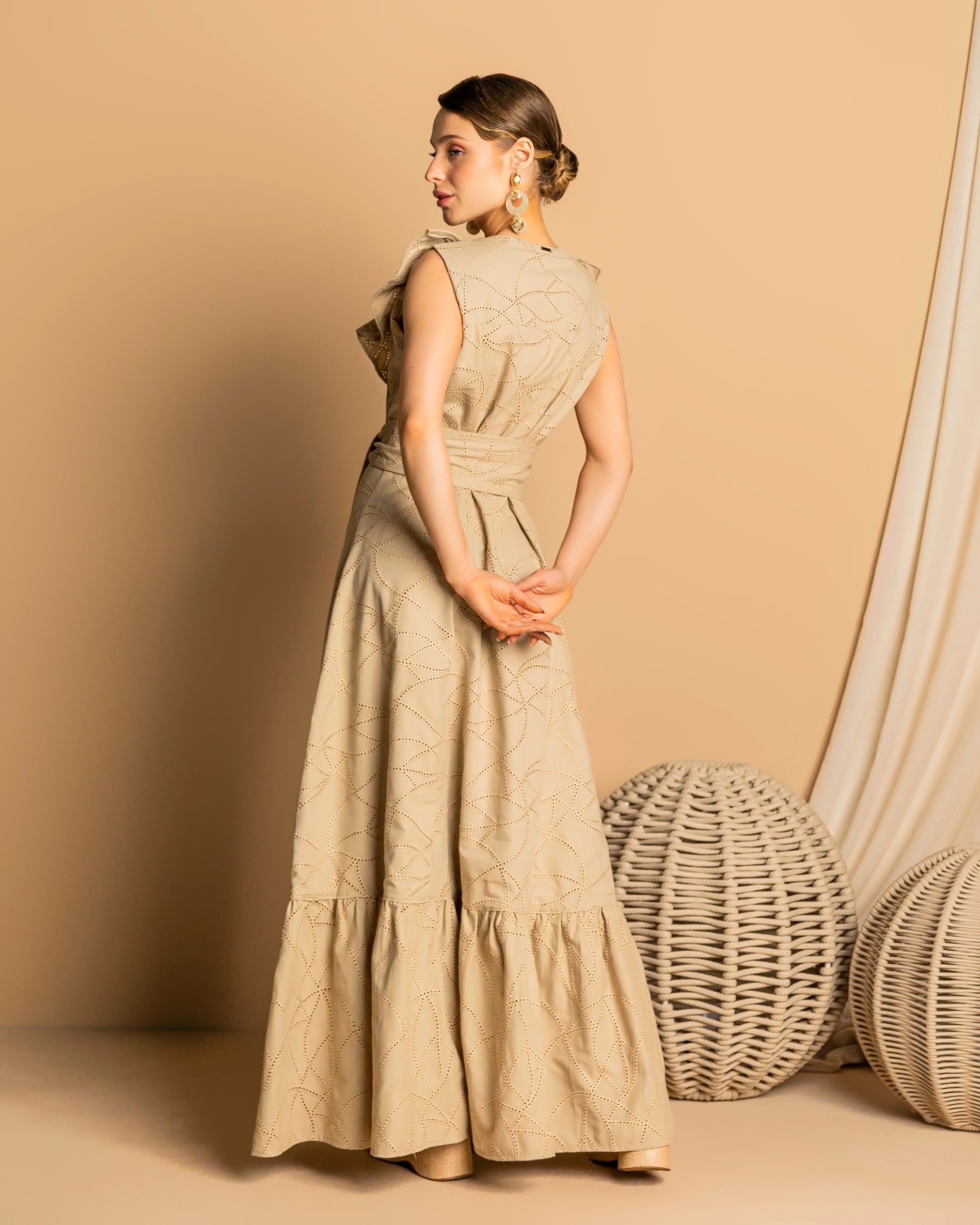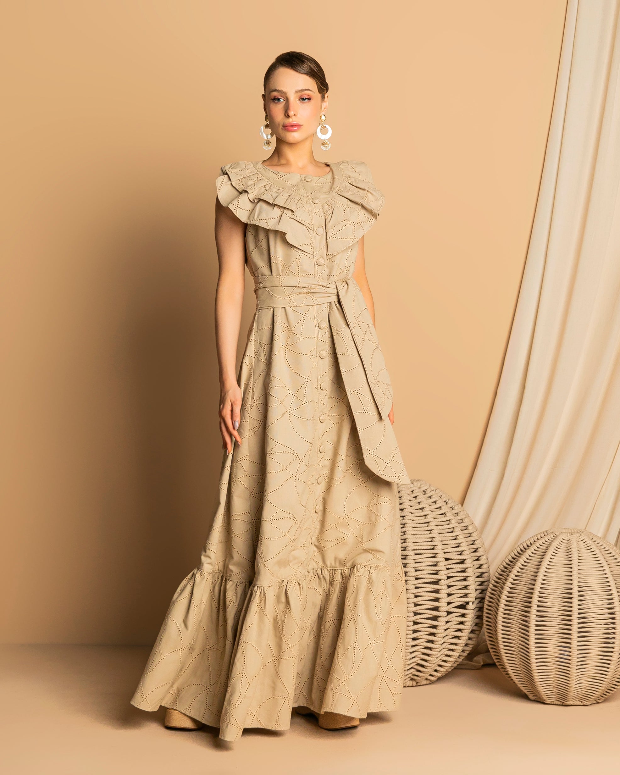 Inspired by timeless artisanal elegance, the Russian Linen and Laise Maxi Dress blends the rustic charm of linen with the delicate beauty of laise embroidery. With its flowing silhouette and intricate details, this dress offers a refined boho look perfect for special summer moments or effortlessly elegant days.