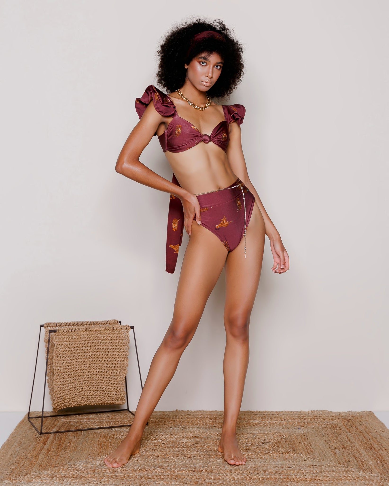 • Ruffled bikini top with adjustable straps or tie-back (depending on style)