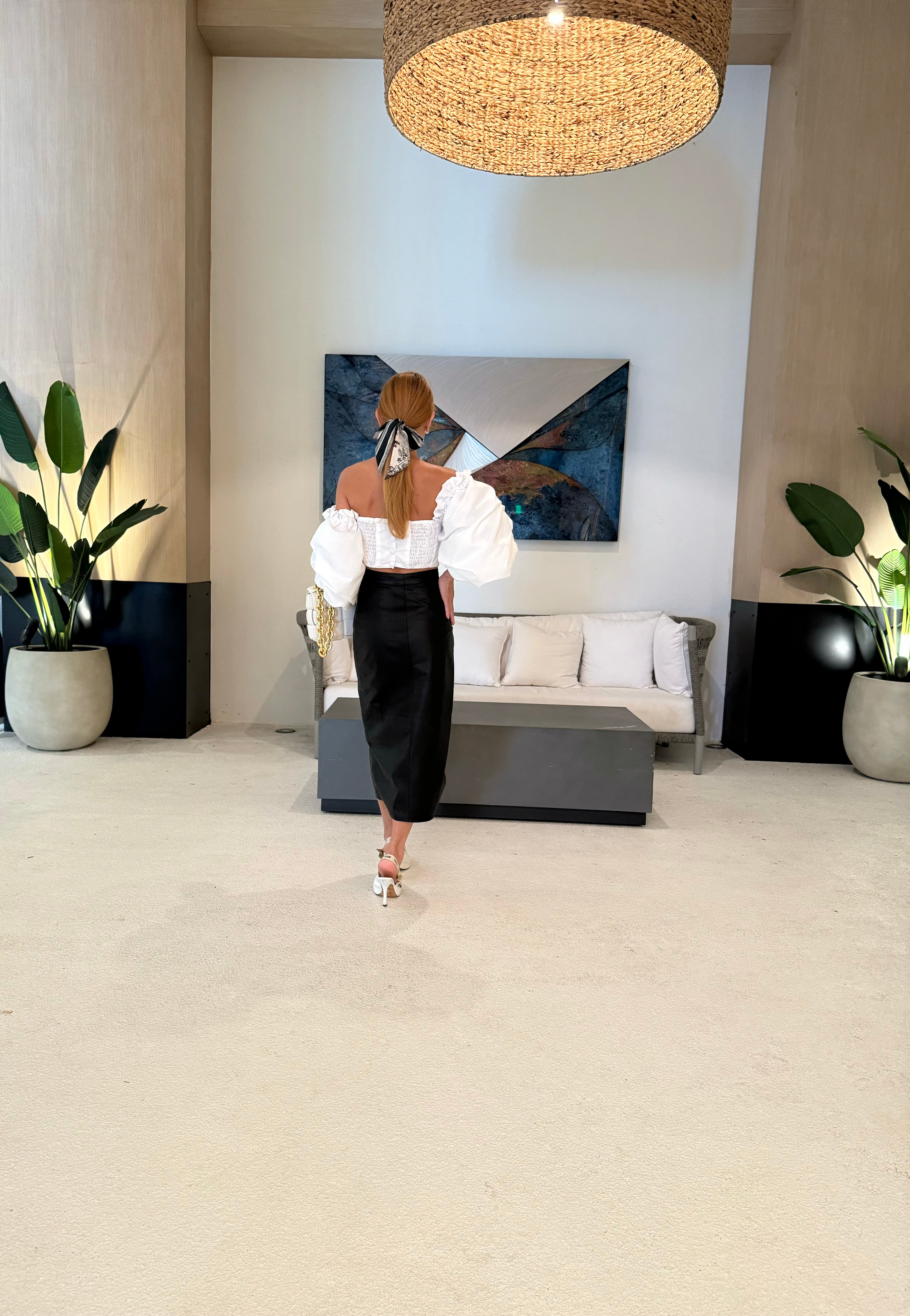 Available in sizes XS to XL. Fitted through the waist with voluminous sleeves. True to size.