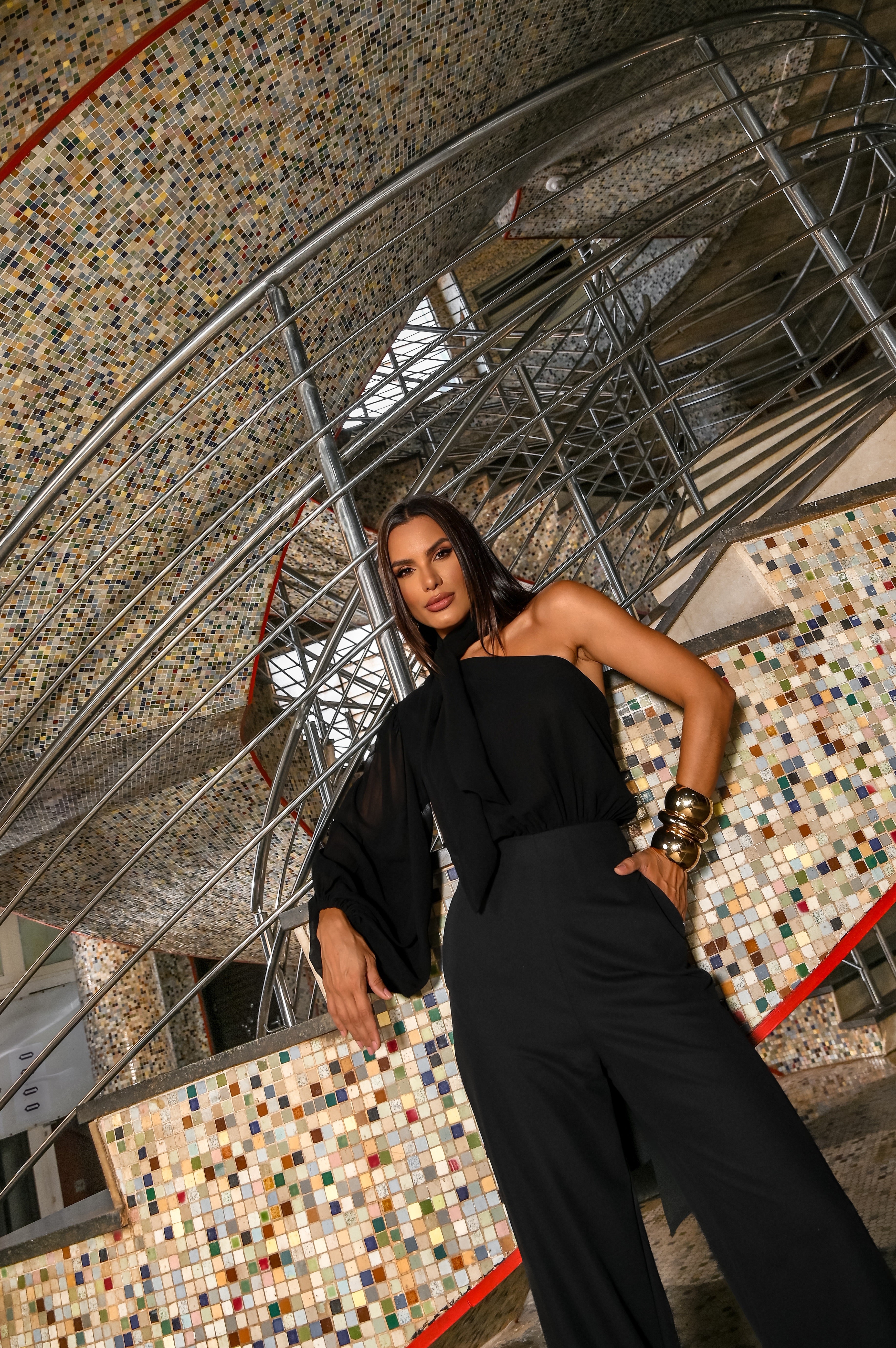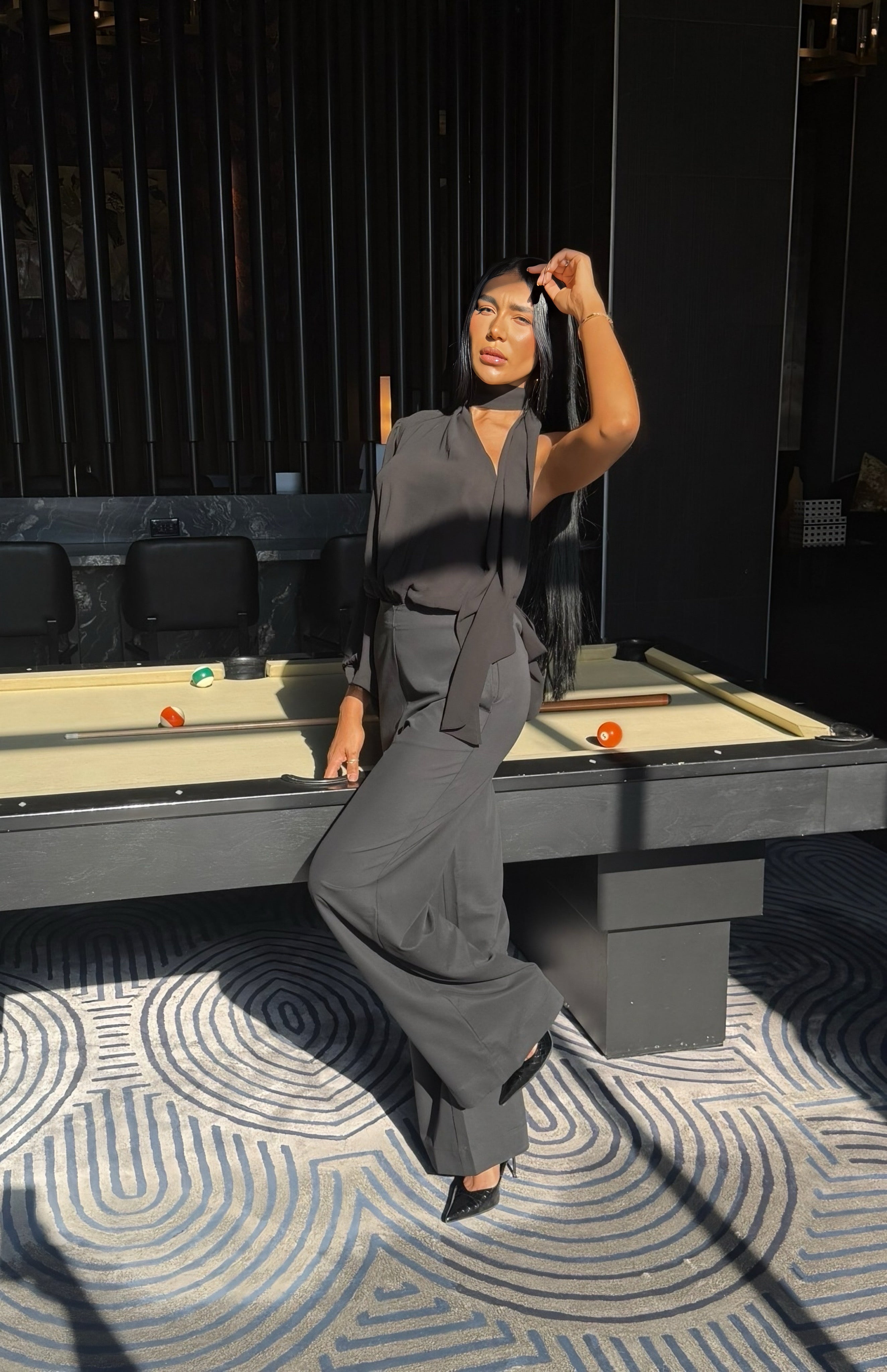 Sleek and sophisticated, this tailored jumpsuit blends structure and fluidity with its wide-leg silhouette and delicate chiffon sleeve. The asymmetric design features an elegant tie at the neck and an open back with a graceful bow, creating a striking balance of modern tailoring and feminine charm.